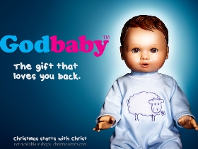 The brown-eyed boy doll in a blue baby grow represents the Baby Jesus, and plays on the idea of Christmas being a time when everyone is searching for that 'must-have' Christmas gift. It carries the slogans – 'Godbaby - He cries, He wees, He saves the world'or 'GodBaby - the gift that loves you back' and is the latest advert from the Christmas Starts with Christ campaign.